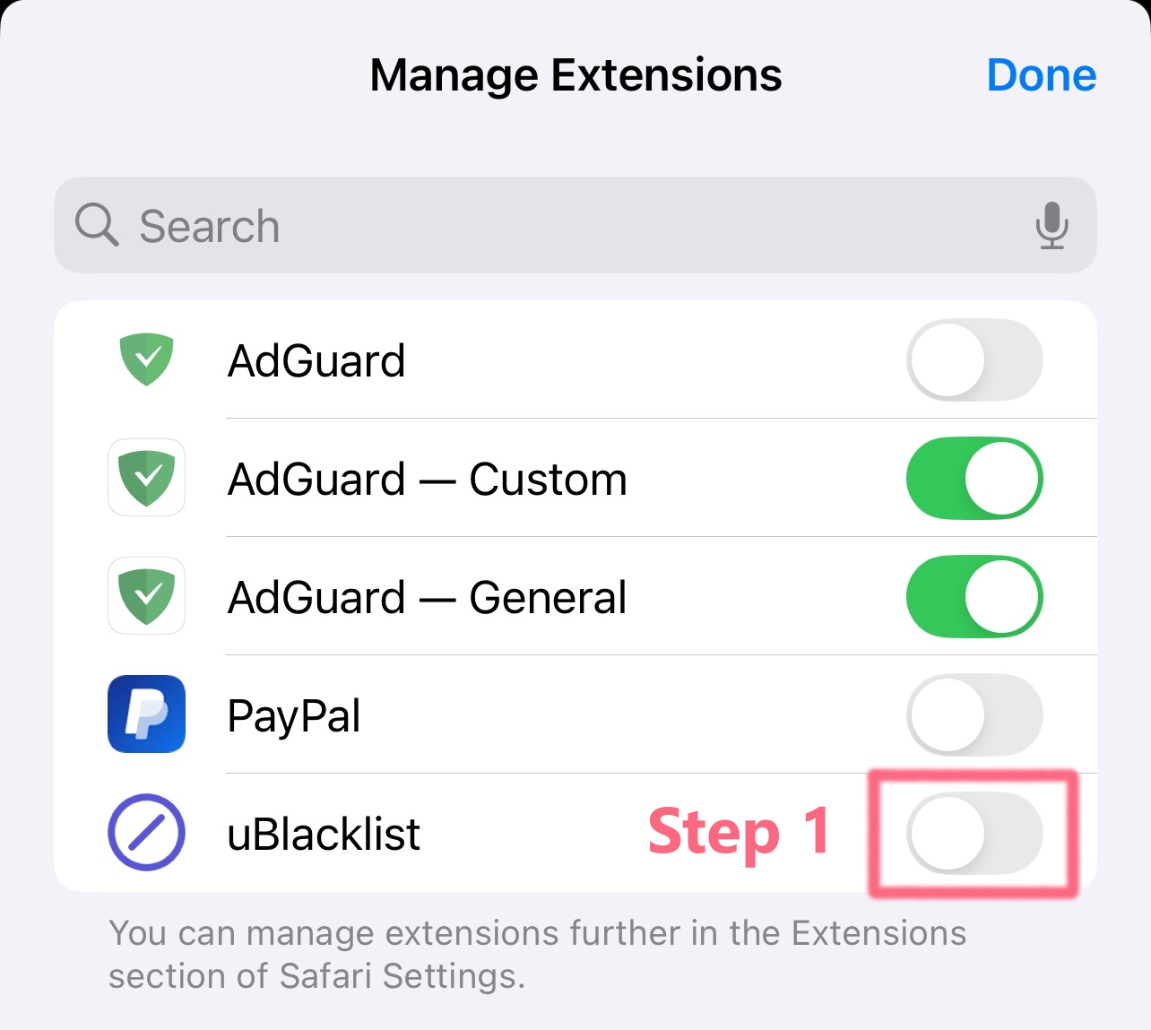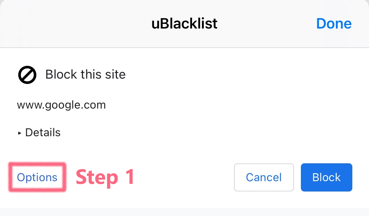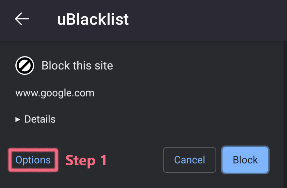 If you use a search engine other than Google, make sure you enable it in uBlacklist. Similar to the steps above for configuring extensions, navigate to the options for uBlacklist.