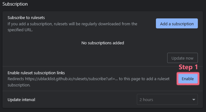 In order to subscribe to blocklists with a single click, we need to enable them in uBlacklist. First, go to the uBlacklist options page. Then, scroll down to “Subscription” and click “Enable ruleset subscription links”: